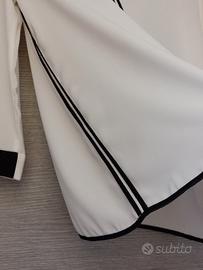 Blusa maeca Zara bicolore di tessuto leggerissimo ideale come capo estivo serale. Elegante con linea scivolata. Ci sono dei profili neri sul davanti, sul dietro e nei fianchi. I polsini sono metà nero e metà bianco. Dimensioni lunghezza cm 60 e spalle cm 38.