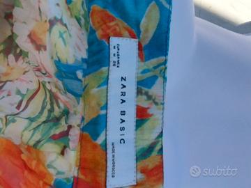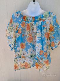 blusa con una vivace stampa floreale caratterizzata da toni di arancione, giallo e bianco su uno sfondo azzurro. Il capo presenta uno scollo arricciato e maniche corte a farfalla o svasate, tipiche di uno stile boho-chic o vintage.
