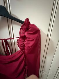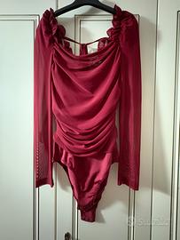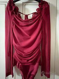 Elegante body con maniche lunghe in tessuto trasparente e dettagli drappeggiati sul davanti. La scollatura quadrata e il design aderente lo rendono un capo versatile.