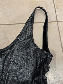 body con glitter argento, schiena scoperta e taglio a brasiliana