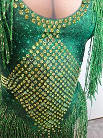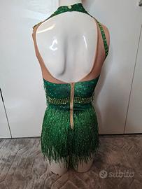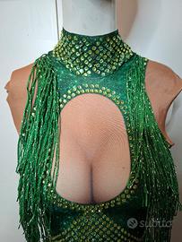 Body da ballo colore verde smeraldo con strass e frange lunghe effetto scenico. Tessuto elasticizzato (veste da S a L) Schiena scoperta con zip Frange su spalle e parte inferiore Perfetto per spettacoli, danza, carnevale ed esibizioni. 📌 Usato in buone condizioni, pronto all’uso 📦 Spedisco subito