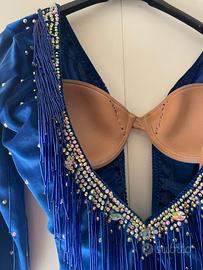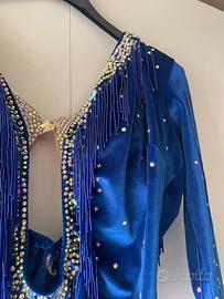 Body da donna in velluto blu per balli caraibici, taglia XS. Con reggiseno incorporato (coppa 3C), comodo e con ottimo sostegno. Decorato con strass, perle e canottiglie, molto luminoso e scenografico. Condizioni: pari al nuovo. Indossato solo una volta per prova, mai utilizzato realmente. REALIZZATO SU MISURA DA SARTA. Inclusi nel prezzo: collana con strass + 2 braccialetti rigidi con strass coordinati.