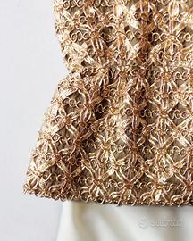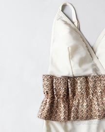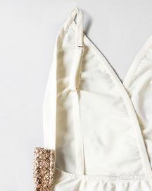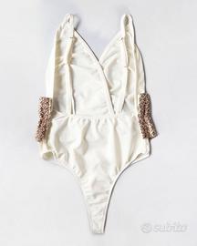 Body bianco in lycra con passamaneria oro in vita, bellissimo. nuovo con cartellino. taglia S, spalline regolabili e gancini sotto. Prodotto Made in Italy