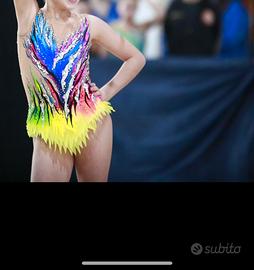 Body infossato poche volte unicamenye per gareggiare. Multicolor con strass e conforme al regolamemto di federazione. Fatto a mano in Polonia e su misura. Per ragazza 11/12 anni, su richiesta posso inviare midure sarta