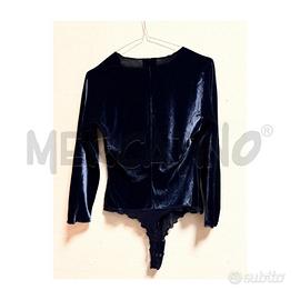 BODY GIORGIO ARMANI IN PREGIATO VELLUTO BLU NOTTE TAGLIA 44. UN CAPO D ALTA CLASSE MADE IN ITALY CON PROFONDO SCOLLO A V E LINEE SINUOSE IDEALE PER SERATE ELEGANTI DOVE LO STILE INCONTRA LA MORBIDEZZA DEL VELLUTO.