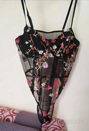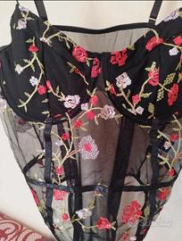 Colore: Nero con ricami floreali rossi, bianchi e verdi. con bretelle regolabili Taglia: L