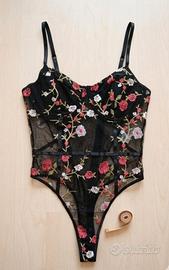 Body in tulle nero ricamato floreale