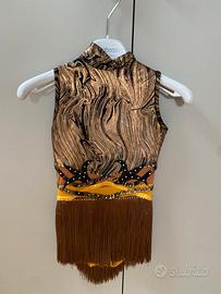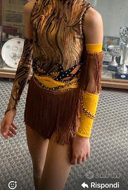 Bellissimo body per pattinaggio artistico usato una sola gara tema re leone. Perfetto per danze stile africa /tribale! Colori bellissimi con stoffa molto luminosa e cangiante x bimba alta 1,30 circa . Possibilita do prender misure se interessati