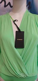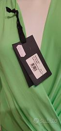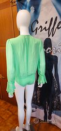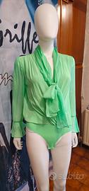 Body tg. 42, nuovo, colore verde, tessuto in Seta, Acetato, Nylon ed Elastane. Pashmina frontale con fiocco staccabile con bottone a scatto. Misure: da spalla a spalla, 37 cm. Da ascella ad ascella, 48 cm. In vita da fianco a fianco, 44 cm. Lunghezza, 51 cm.