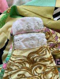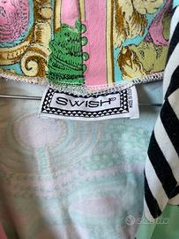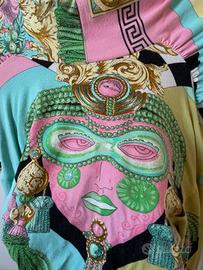 Elegante body con fantasia modello Versace, disegni optical bianchi e neri e greca nera sul davanti. Sulla schiena il disegno di una maschera riccamente decorata con fregi dorati. Le maniche sono lunghe con disegni che trovate meglio rappresentati nelle foto. Sul davanti il tessuto si incrocia in un profondo scollo a V. Il capo si chiude con 3 gancetti di metallo bianchi. Taglia M. Tessuto: 93% spun rayon e 3% elastomero. Indossato raramente, presenta qualche pallino dovuto al lavaggio per conservarlo.