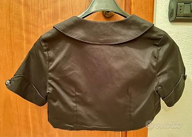 Bolero coprispalle nero corto a maniche corte marca Banned. Cropped bolero. Taglia S, veste aderente. Tessuto abbastanza spesso e resistente. Colletto stile Peter Pan.