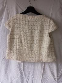 Bellissimo bolero da donna di Escada, taglia 40, colore panna a fantasia a quadri marrone chiaro, maniche corte, chiusura a gancio, tessuto pregiato composto da: 64% cotone, 32% nylonbev4% poliestere. Fodera % 100% seta. In perfette condizioni.