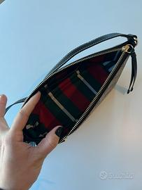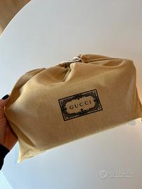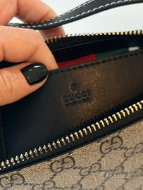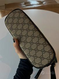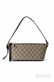 Borsa mini bag stile GG in tela beige/marrone con finiture in pelle nera. ✔️ Forma baguette elegante ✔️ Chiusura con zip ✔️ Tracolla corta da spalla ✔️ Leggera e comoda 📏 Dimensioni: 22 x 10,5 x 9 cm 📦 Condizioni: Nuova