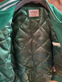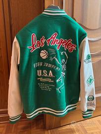 Bomber stile college in verde e bianco. - Patch California Bay East Coast 1957 sul petto. - Scritta L.A. U.S.A. sul petto. - Dettagli a coste su colletto, polsini e fondo. - Tasche laterali a filetto. - Misure in foto
