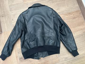 • Materiale: Pelle premium morbida ma strutturata, colore nero intenso. • Design: Classico taglio bomber con colletto a camicia e chiusura a zip robusta. • Dettagli: Due ampie tasche anteriori a soffietto con patta e chiusura a bottone. • Comfort: Polsini e fondo in maglia elasticizzata per una vestibilità perfetta che protegge dal vento. • Interno: Fodera trapuntata color verde militare, ideale per le mezze stagioni e l'inverno. Taglia M Condizioni 9/10 Prezzo leggermente trattabile