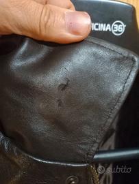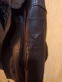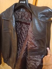Bomber in pelle, riproduzione di quelli in uso ai piloti, taglia su etichetta S ma veste una 48/50. Colore testa di moro, condizioni ottime, unico difetto nella parte inferiore del colletto dx (vedere ultima foto, comunque non visibile a capo indossato)