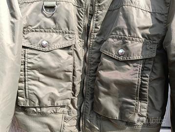 Giacchetta di Primark verde militare taglia 46/8 (maniche lunghe circa 58cm, busto alto circa 50cm e largo da spalla a spalla circa 45cm). Dotata di quattro tasche sul busto e un'altra con cerniera sulla manica destra. Fasce elasticizzate al collo, polsini e vita. Tessuto esteriore nylon, fodera e imbottitura poliestere