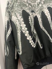 Vendo iconico bomber Octopus Brand, modello Varsity con la celebre grafica a tentacoli. Il design unico sfuma da un effetto tie-dye/nuvolato grigio e bianco sulla parte superiore al nero profondo della base.