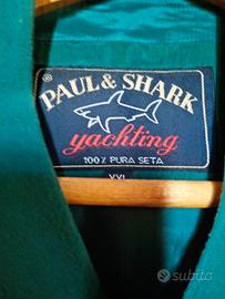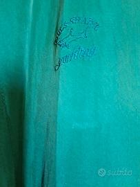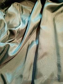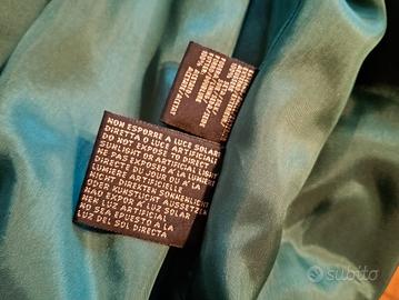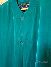 è in pura seta finissima, polsi e collo in maglia, fodera in raso, usato una volta e portato in lavanderia , bellissimo colore verde smeraldo