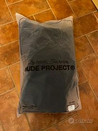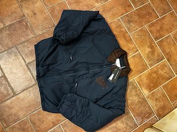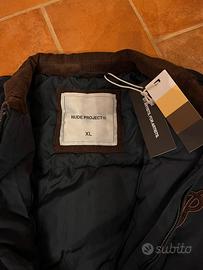 bomber da uomo blu notte, con colletto e ricamo sul petto bordeaux/marrone scuro in simil velluto. cerniera e zip argento. taglia XL. NUOVO mai indossato. era un regalo, ma il destinatario mi ha accannata prima che potessi annullare l’ordine. compratelo perfavore. non lo voglio più vedere dentro casa. marca Nude Project.