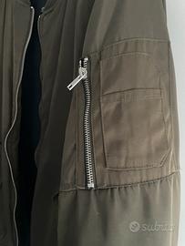 Vendo bomber da uomo Bershka Menswear Collection, taglia M, in ottime condizioni. Colore verde oliva, design moderno e versatile. Chiusura con zip, tasche frontali con bottoni a pressione e tasca con zip sulla manica, perfetta per piccoli oggetti o accessori. Polsini, colletto e fascia inferiore a costine per una vestibilità comoda e aderente. Ideale per look streetwear, casual o per le mezze stagioni.