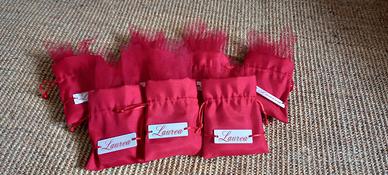come da foto, 7 sacchettini in tessuto rosso con scritta Laurea su targhetta in legno. sono compresi i tulle (2 x sacchettino) x i confetti.