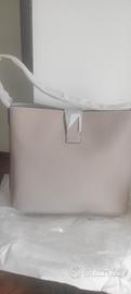 BORBONESE MODELLO FONDANT a spalla di pelle taupe, TOTAL BAG, colore cipria, con chiusura a fibbia e scomparto con cerniera, NUOVA ancora con il metallo plastificato, senza nessun difetto, etichette e codici identificativi, sacchetta della polvere e sacchetto plastica con sopra etichetta e barcode.