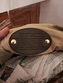 Manici e profili in pelle o materiale scamosciato in una tonalità scura (probabilmente marrone testa di moro) e accessori in metallo color oro, come visibile dalle borchie decorative sull'ovale frontale e dalla zip.