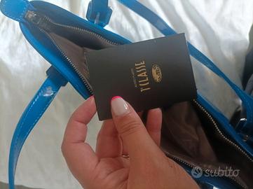 mai usata, in pelle lucida Blu elettrico dimensioni 42*30*11,5
