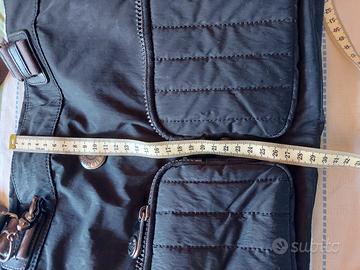 borsa a spalla e tracolla marca kipling colore nero. misure valide come bagaglio a mano in aereo ( usata da mio marito lo scorso anno). tre capienti scomparti di cui uno con portachiavi interno. non ha passante per manico trolley