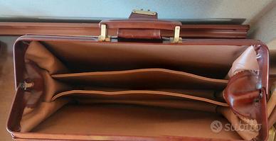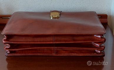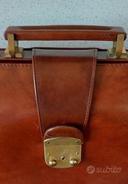 Borsa in vero cuoio . Esterno - manico in pelle - apertura tramite cerniere di metallo rivestite in pelle, con fibbia in pelle centrale con chiusura. Interno 3 scomparti con fodera