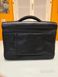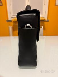 Valigetta da lavoro 24h marca Mandarina Duck, in pelle nera con tracolla in tessuto sintetico (nylon). All'interno sono presenti tre scomparti (scomparto centrale per desktop max 17", due tasche di cui una con zip, portapenne e porta cellulare. Nel parte posteriore è presente un'asola con zip per collocare la borsa sul trolley. Dimensioni borsa cm 42x30x11.