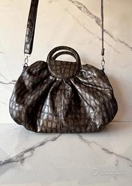 Borsa in ecopelle grigia con stampa effetto cocco lucida, dalla forma morbida a sacca. Sul fronte spicca il manico integrato, stondato e sagomato, che si ripiega elegantemente nella struttura della borsa. La tracolla è regolabile e removibile, realizzata nello stesso materiale cocco-embossed, con ganci e anelli in metallo cromato per un indosso a spalla o a tracolla.