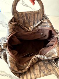 La chiusura principale è con zip marrone, che apre a un unico ampio scomparto foderato in tessuto marrone scuro. All’interno si trova una tasca con zip per riporre piccoli oggetti e due taschine aperte applicate lungo la parete interna.
