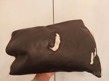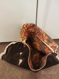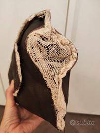 Vendo borsa a busta artigianale in vera pelle di color marrone scuro. In vari punti ha dettagli in pizzo beige. L interno riporta una cerniera e imbottitura in fantasia di tessuto di tappezzeria. Dimensioni lunga lato lungo 40 lato corto 32 alta 20 profonda 6