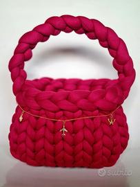 Bellissima borsa a mano realizzata a maglia, di colore rosso intenso.