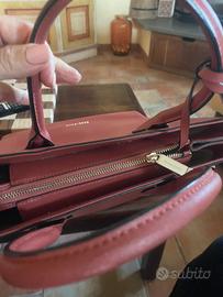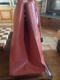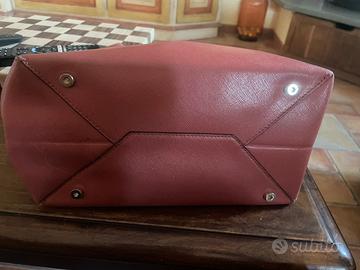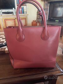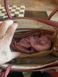 Borsa in pelle color salmone chiusura con cerniera due sconoarti interni con ulteriore taschina con cerniera e altre due taschine ha i gancini per tracolka ma non ricordo di averla mai avuta