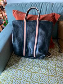 Borsa a mano convertibile in zaino, vera pelle prodotto artigianale, made in italy, realizzata a Firenze. Molto capiente. Struttura morbida. Interno in tessuto, da un lato due tasche aperte e dall’altro una tasca chiusa da zip. La borsa è chiusa da lampo. Bretelle in tessuto e manici tessuto e pelle. Nuova mai indossata, pagata 103 euro vendo a 50 euro. Misure cm 45x38x12.