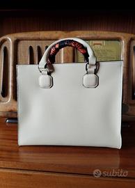 Borsa a mano e tracolla beige con foulard attorno a uno dei manici.