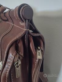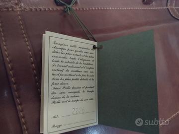 Da foto, marca Pielle in cuoio marrone, maniglia e tracolla smontabili con bottoni automatici, cerniere per aumentare il volume e cartellino con numerazione prodotto.