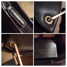 Splendida borsa a mano o a spalla Gucci bamboo, marrone, in pelle, con il classico manico in bambù testa di moro. Cursore logato Gucci, placchetta marrone classica logata all'interno, con, sul retro, il codice seriale. Interno in pelle marrone, con taschino interno, munito di cursore metallico dorato con icona Gucci. Borsa vintage fine anni '80-primi anni '90. In generale in ottime condizioni, compatibilmente con l'età, tuttavia segnalo segni di usura negli spigoli, visibili in fotografia. Le misure :26,5 centimetri lunghezza ;22 centimetri altezza;9,5 centimetri profondità, 15 centimetri altezza manico. Senza imballaggio originale