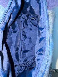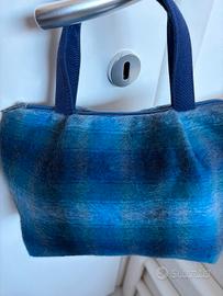 borsa a mano piccola in tessuto d'arredamento scozzese blu con fodera interna, tasca e chiusura con zip.