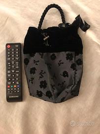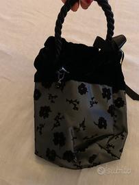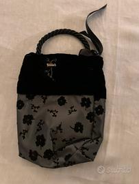 Borsettina a mano in tessuto damascato e bordo in velluto, da poetare al polso tramite maniglia in corda, chiusura a strozzo.