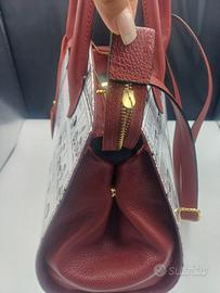 Borsa a mano in vera pelle bordò con stampa fumetti Mafalda, realizzata da artigiani italiani. Tracolla allungabile e manici alti 20 cm. Capienza aumentabile aprendo le clip laterali. Altezza 27, larghezza base 16, lunghezza 38,5. Chiusura a zip, foderata, 1 ampia tasca interna + 2 taschini.
