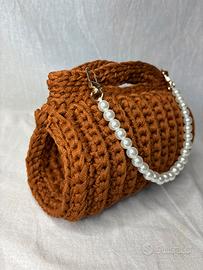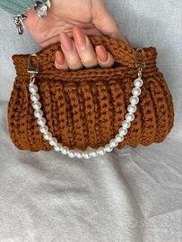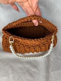 Borsa a mano marrone ambra uncinetto catena perle