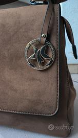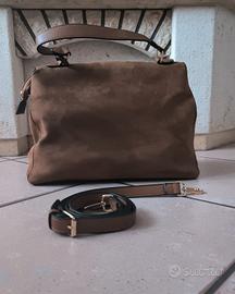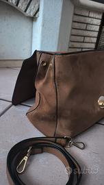 Borsa in camoscio marrone, modello a mano con inclusa tracolla regolabile e removibile, dotato di chiusura frontale con clip metallica e charm decorativo PrimaDonna. Interno capiente con due tasche, una con zip e una senza zip, ideale per uso quotidiano. Dimensioni: larghezza 33cm x altezza 23cm x profondità 13cm