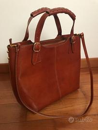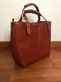 Vendo borsa a mano rigida in pelle color cognac con tracolla. Larghezza x Altezza x Profondità: 37x 30 x 12 cm (manico escluso). Made in Italy. Genuine leather. Nuova, mai usata. Consegno a mano a Milano. Spedisco in tutta Italia (spese di spedizione a carico dell’acquirente).
