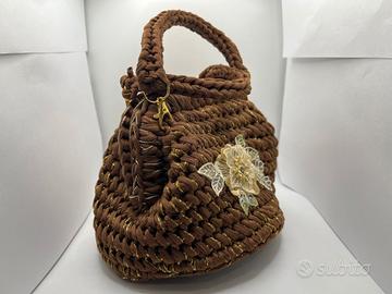 Questa borsa fatta a mano è un piccolo gioiello di artigianato: realizzata all’uncinetto con filato marrone impreziosito da fili dorati, sprigiona stile e raffinatezza in ogni dettaglio.