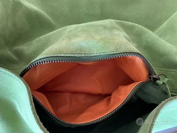 chiusura con bottone magnetico, tasca interna con zip foderata in tessuto arancione, fodera interna in cotone stessa tonalità della borsa, una tasca con zip.
