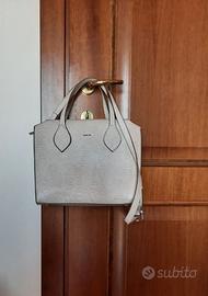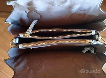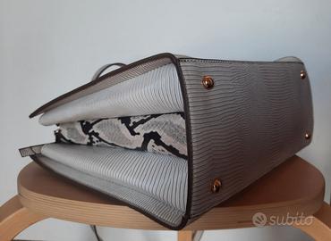 Borsa da signora, a mano/tracolla, marca PARFOIS. Esternamente la tonalità del colore è tra beige e grigio, con un motivo animalier delicato su fronte e retro e più marcato sui laterali dove c'è una fascia pitonata. La chiusura principale è a doppia calamita, come nella foto presa dall'alto. Internamente, la fodera è color tortora e sono presenti due scomparti con cerniera e altri senza. Usata per un'occasione, vendo per inutilizzo. Possibilità di ritiro presso il domicilio del venditore.